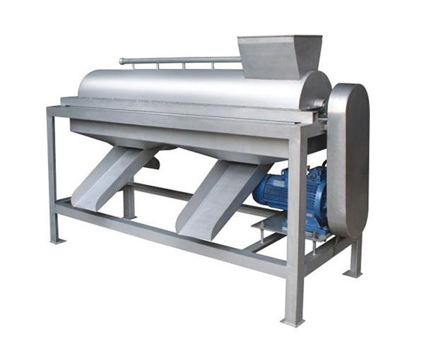 电机通过三角带传动,使转子部件高速旋转,水果由进料口进入机内,送料浆叶将物料螺旋输送至去核棒,在去核棒的作用下,物料被捣烂。由于离心力的作用,物料中的汁液和肉质(已成浆状)通过筛网上的筛孔进入下道工序,核则由出渣浆叶排出出渣口,从而实现浆渣自动分离。当果肉进入二道筒体内时,挡浆盘将物料均匀排发到刮板和筛网之间,由于刮板的回转作用和导程角的存在,使物料沿着园筒向出口端移动,移动的轨迹呈螺旋状,物料在刮板和筛网之间移动过程中受离心力的作用而被擦碎,汁液和肉质(已成浆状)从筛孔通过进入下道工序,皮和籽等则从出渣斗排出,从而达到自动分离的目的。