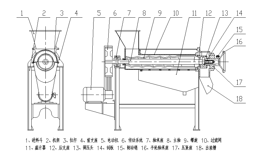 由前支座、进料斗、螺旋、过滤网、盛汁器、后支座、出渣槽等组成,螺旋主轴左端支撑于滚动轴承座内,右端支撑于手轮轴承座内,电机通过一对三角皮带驱动螺旋进行工作。